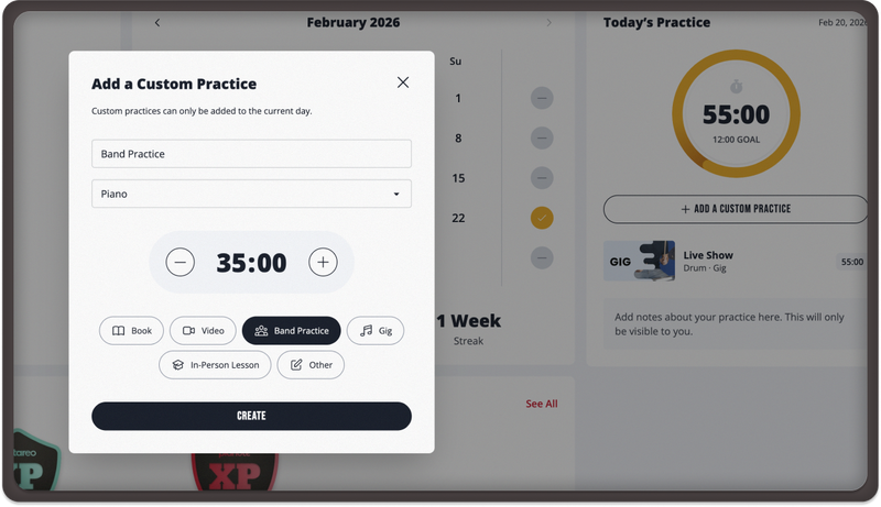 The Practice Tracker automatically records the time you spend in lessons and songs, and lets you log off-platform practice like scales, sight-reading, or rehearsals. Review daily and weekly stats, add notes, and see your full practice history in one place — so progress is measured, not guessed.