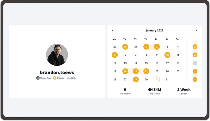 Streaks track how consistently you practice, both daily and weekly. Instead of rewarding random activity, they're designed to reinforce sustainable habits — helping you stay accountable, build momentum, and avoid the stop-start cycle that slows long-term progress.